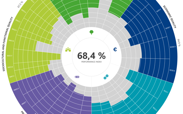I Danmark bruges DGNB-systemet til at certificere bæredygtige byer og bygninger. Masterplanen for Stadionkvarteret er blevet evalueret i DGNB-systemet på fem hovedområder og 32 kriterier, som alle får point ud fra graden af, hvor bæredygtige løsninger masterplanen lægger op til i udviklingen af Stadionkvarteret. Ud over guld kan byområder også certificeres med sølv og platin.